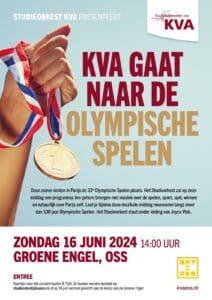 Op zondag 16 juni 2024 geeft het Studieorkest van KVA haar jaarlijkse concert, dit keer met de Olympische Spelen als thema. Het Olympisch concert begint om 14.00 uur in cultuurpodium De Groene Engel in de Kruisstraat in Oss en duurt tot 15.30 uur. Kom 16 juni luisteren en laat je meevoeren langs muziek van 100 jaar Olympische Spelen. Kaarten voor het concert kosten € 7,50 en bestel je via studieorkest@kva.siteinaanbouw.nl. Op 16 juni kun je kaarten kopen aan de kassa van de Groene Engel.