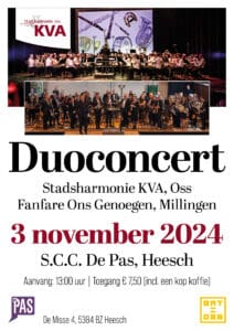 Op zondag 3 november 2024 geven stadsharmonie KVA en fanfarekorps Ons Genoegen uit Millingen een duo-concert in cultureel centrum De Pas aan De Misse in Heesch. Het concert begint om 13.00 uur. Beide orkesten spelen 45 minuten, met tussendoor een pauze. Kaarten voor het duo-concert kosten € 7,50, koffie of thee in de pauze inbegrepen. Op 3 november te koop aan de kassa van De Pas.